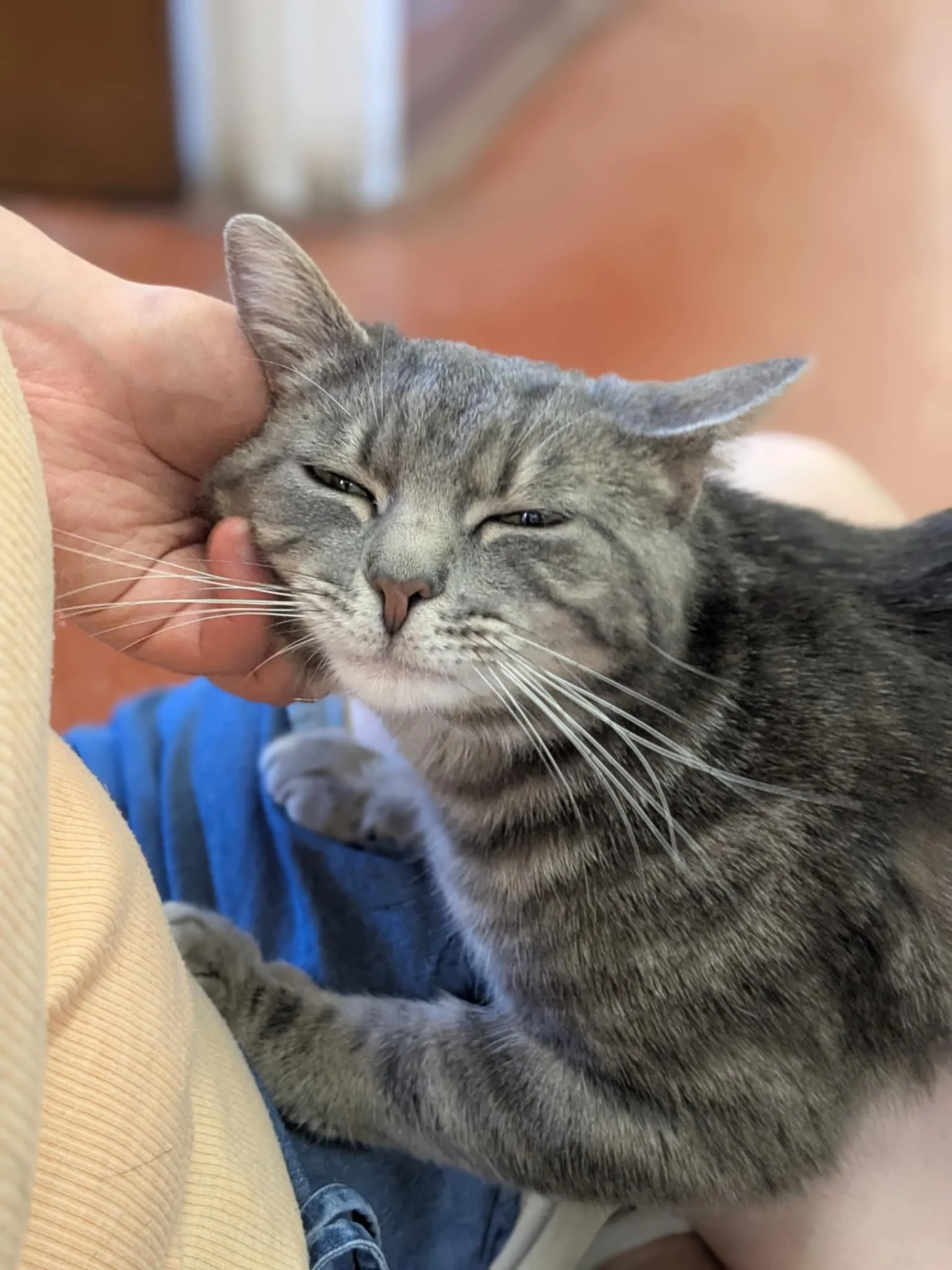 I am a very friendly boy who really, really loves cuddles (especially whilst sitting on a human’s lap!). I am quite vocal and will shout at you for attention, or food, or anything else I might feel I am in desperate need of right that moment! Like for you to sit down so I can sleep on your lap! I can be playful but am quite chilled too- I am happy to entertain myself while being nosey and watching what’s going on or curling up for a snooze. I should admit that I do have a bit of a grumpy side too, but doesn’t everyone? I will let you know if you are annoying me or I want you to leave me alone for a while, but my carer says once you know me well, you will be able to read my body language which will warn you when I’ve had enough. This will save me the effort of having to nip or punch you so is most helpful for me too!