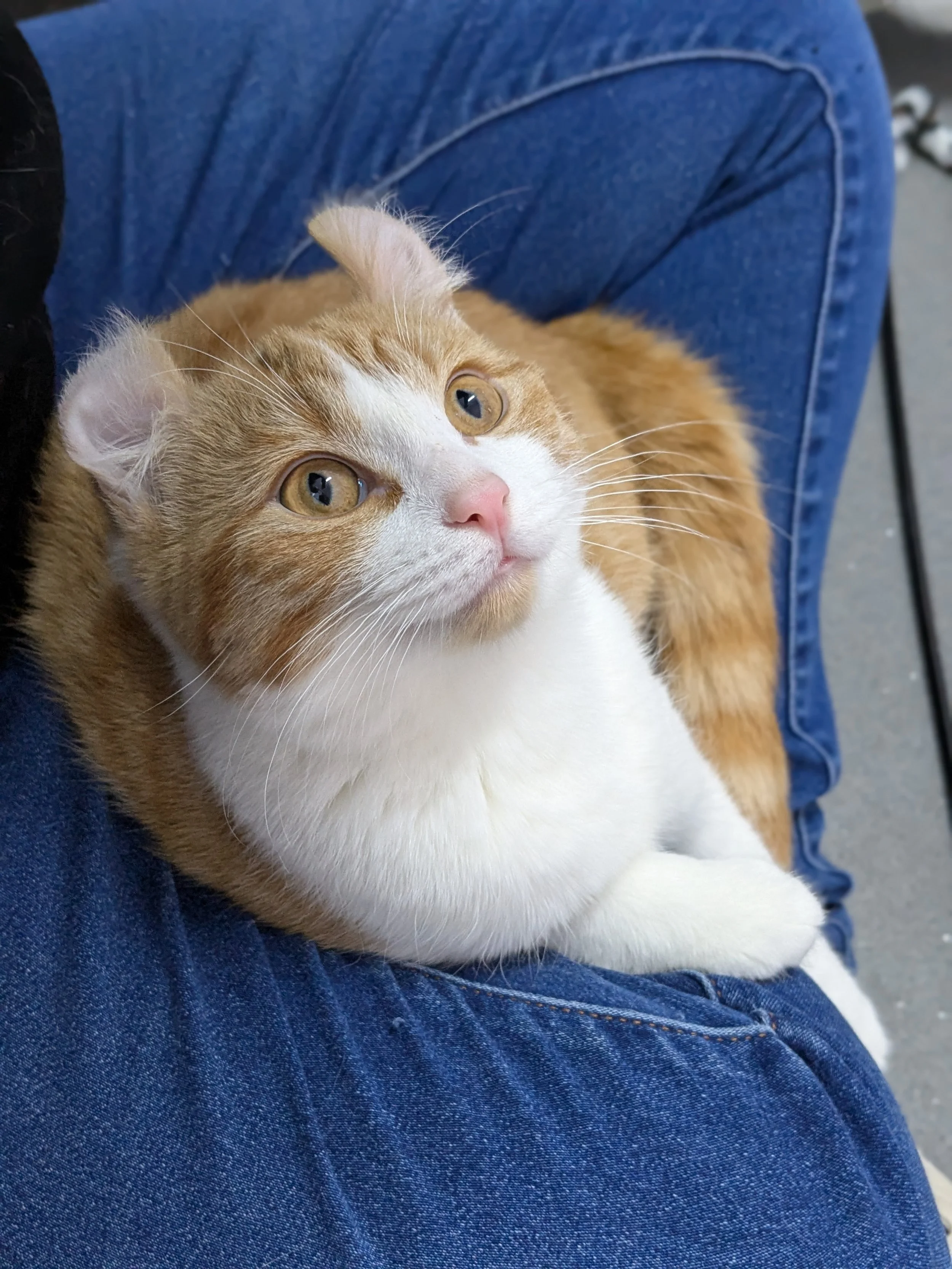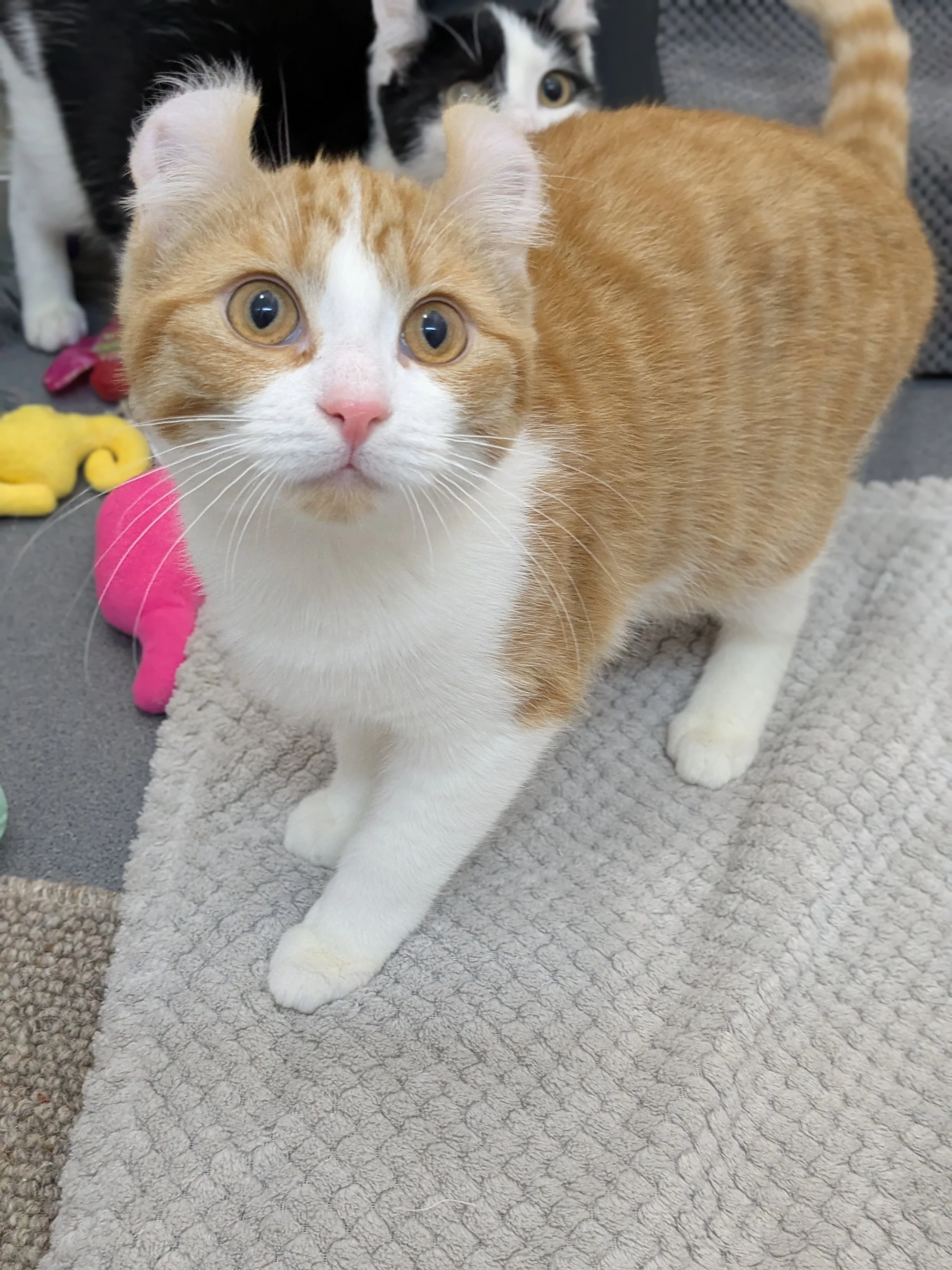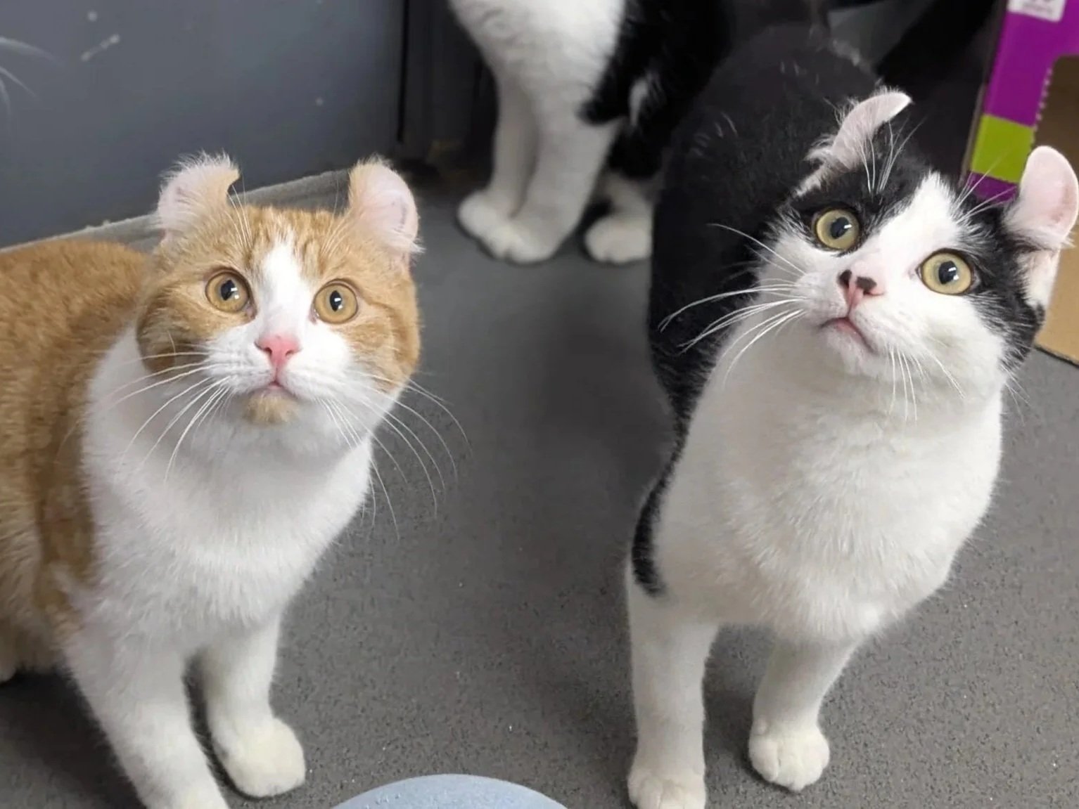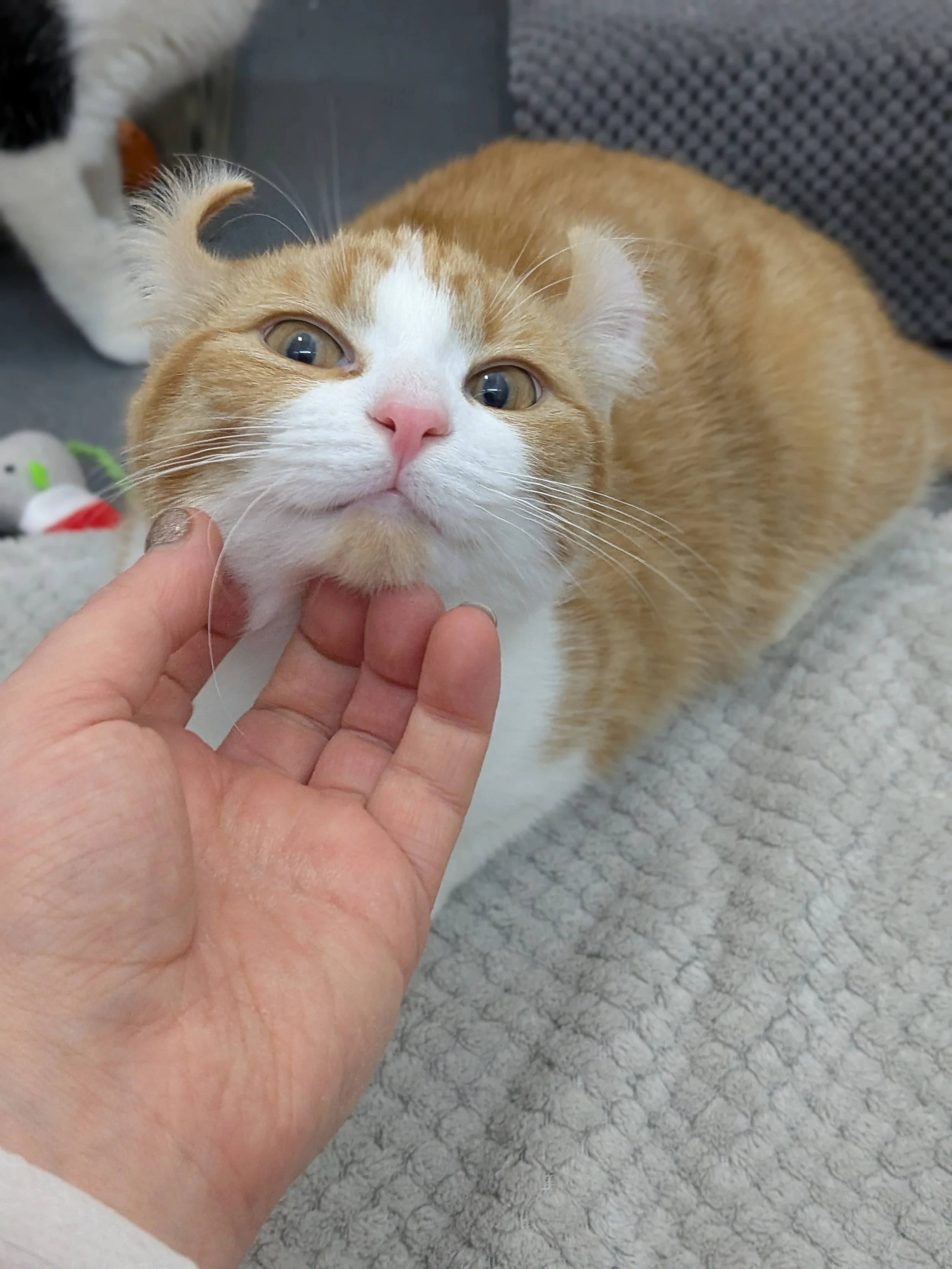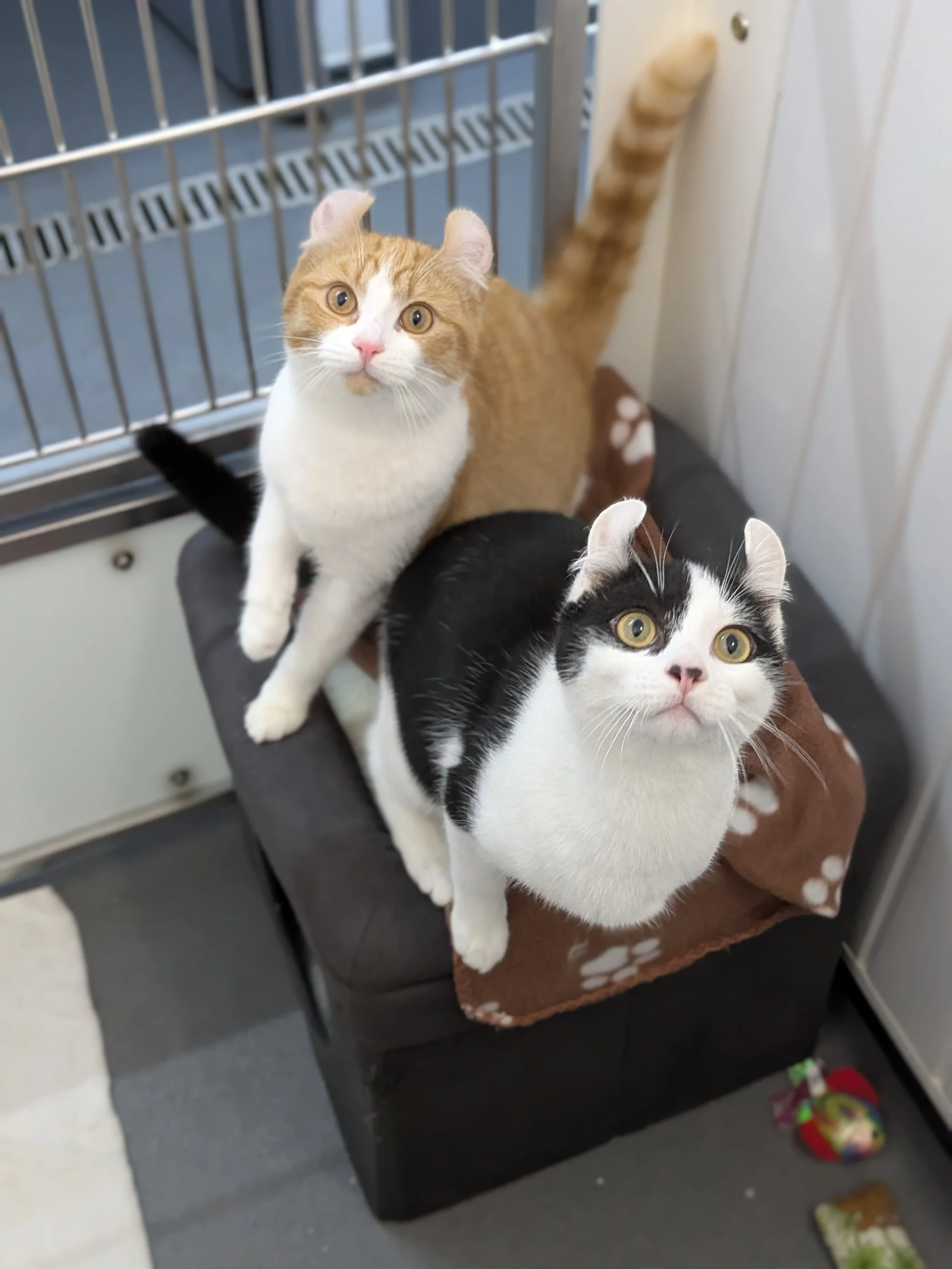 TO NOTE- Due to our curled ears, our carers believe we may have some American Curl in our genetics, and we know our mum was a Sphynx. As we both have fur, we’re unlikely to experience the common skin issues seen in Sphynx cats. However, American Curls can be prone to cartilage-related ear problems and occasional joint issues, so there’s a small chance we could develop ear or cartilage concerns in the future.