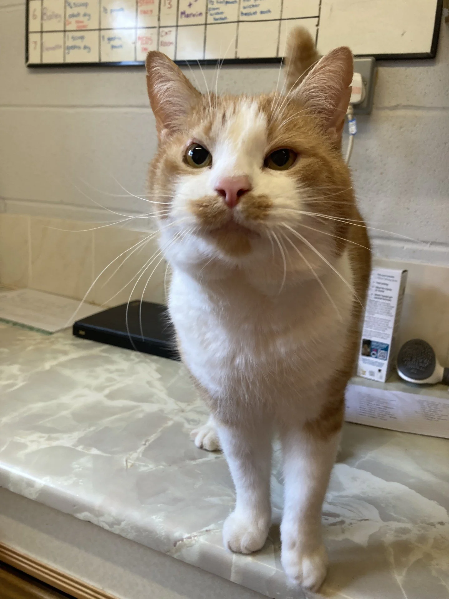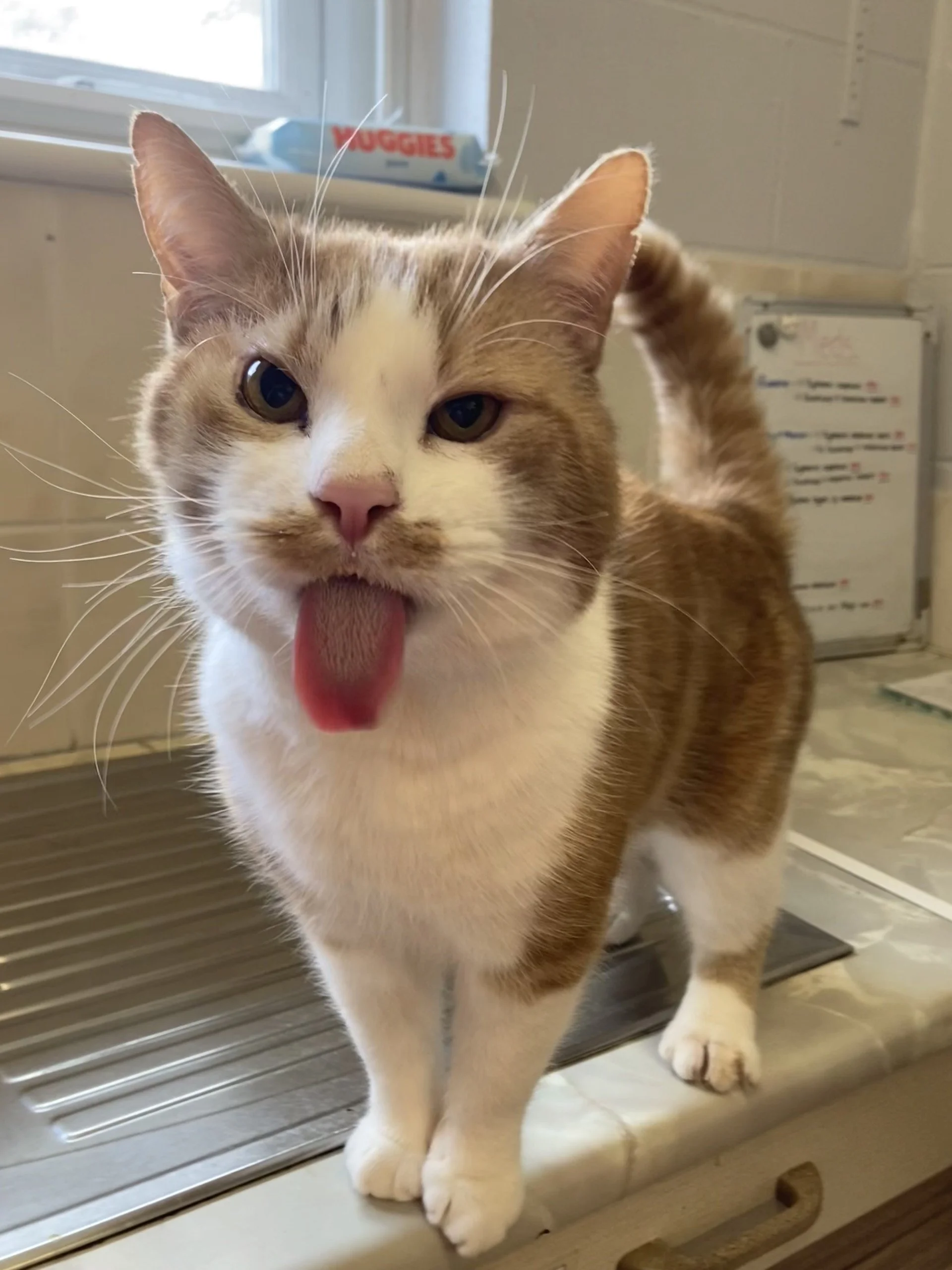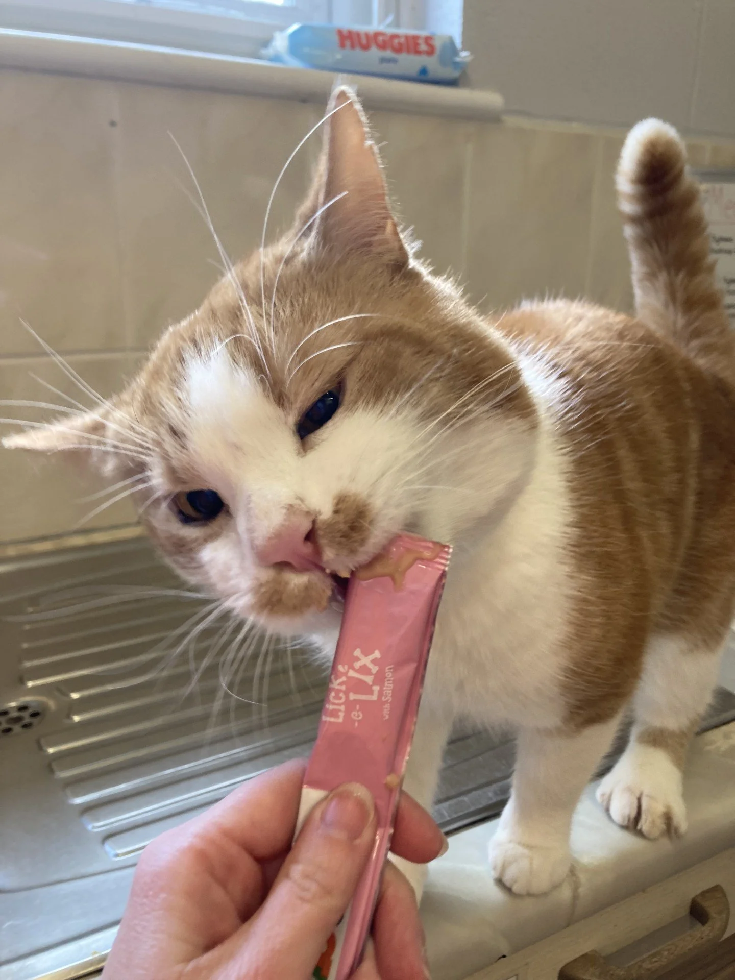 (Note from my carer as she knows I won’t say it: Gingey did come to us a little overweight so is currently on a ‘light’ food and has been on a diet, he has done well and is now a good weight. But his adopters will need to be aware that he will make out that he is hungry all the time, and try to steal food! He is not hungry all the time and does not need to be eating every hour of the day (sorry Ginge!) Puzzle/slow feeders do help, although Ginge doesn’t really appreciate them haha)