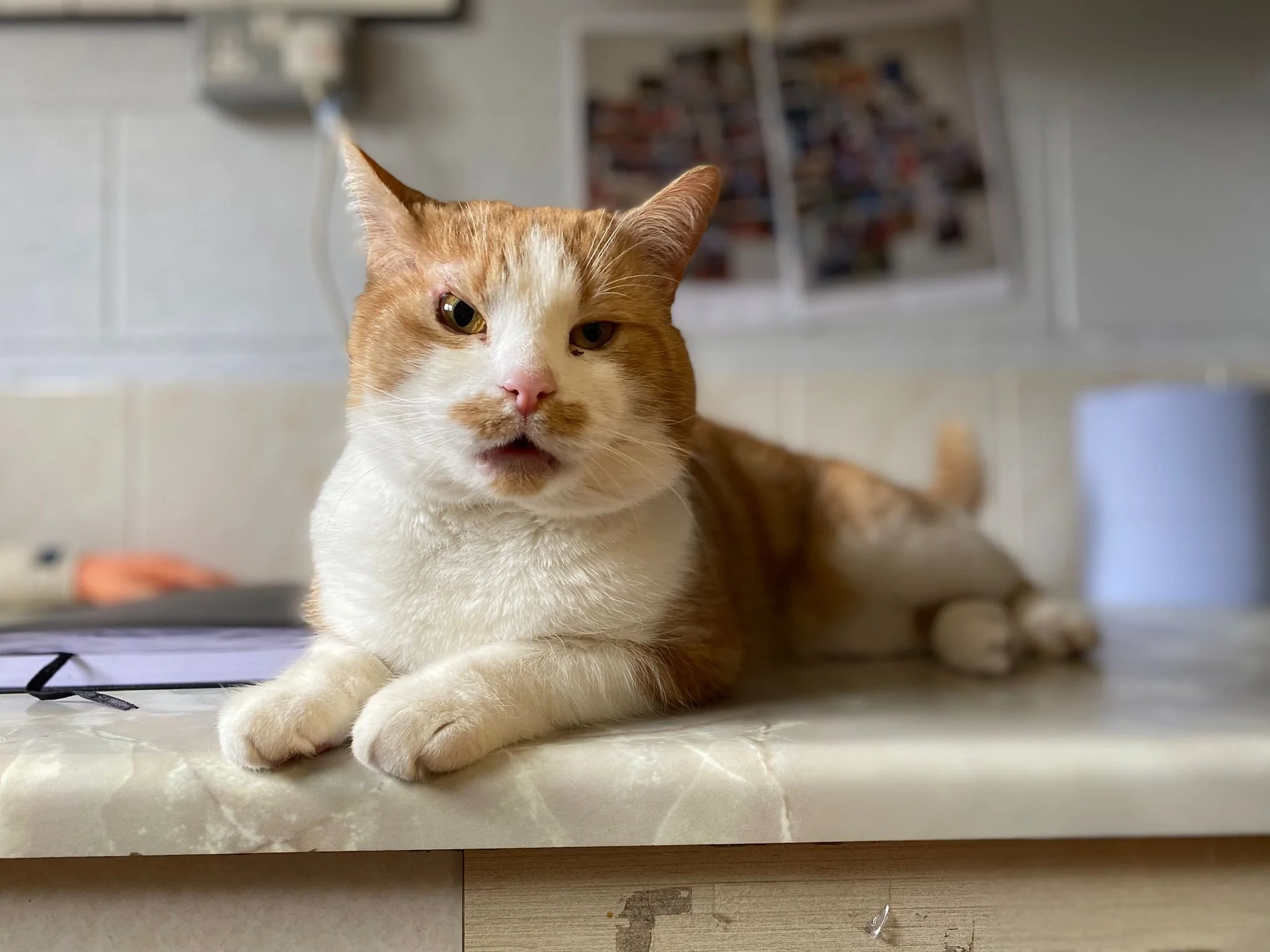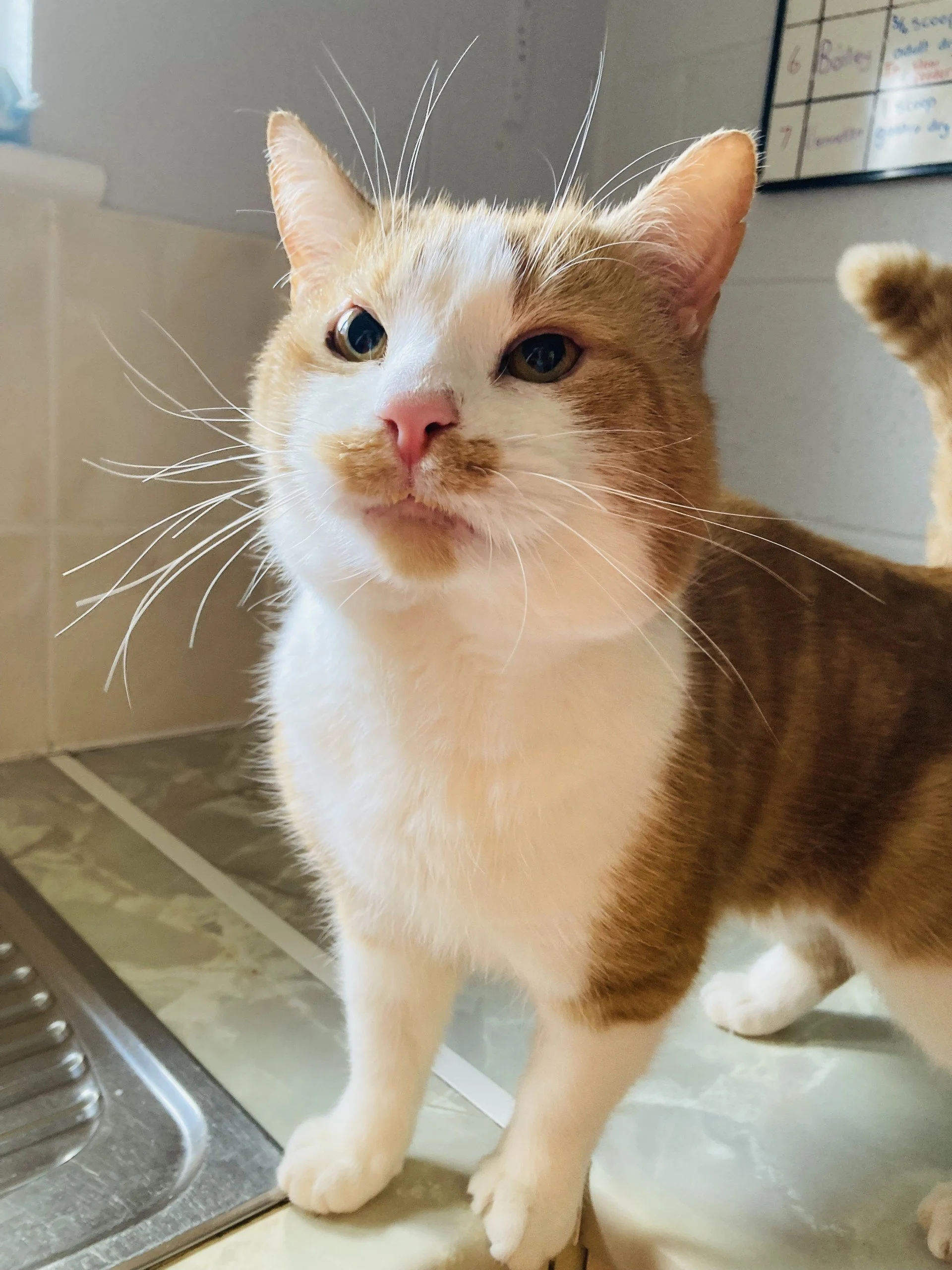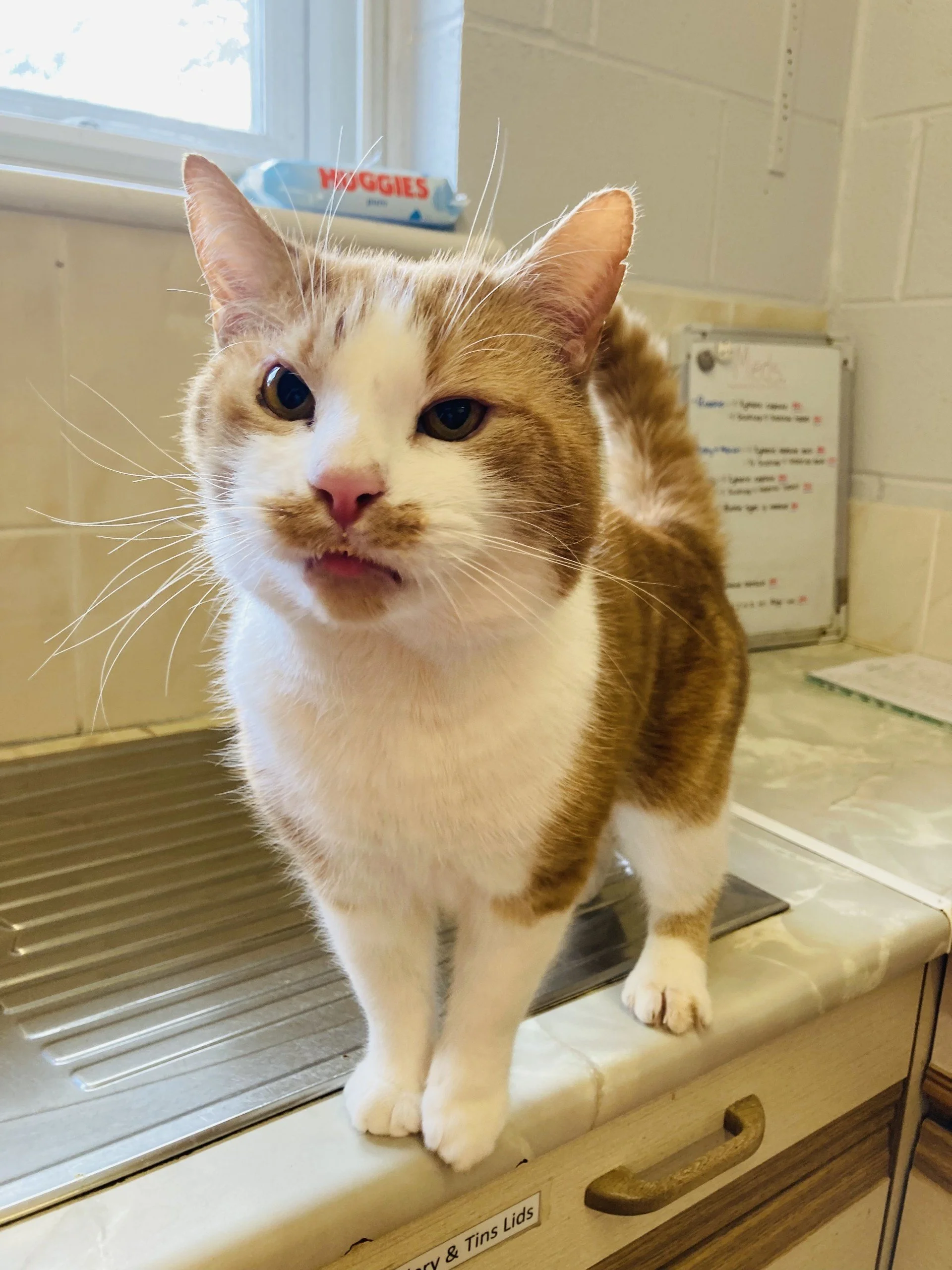 Most of the time, I am a laid-back placid boy who enjoys a snooze and occasionally a play. I’m quite easy-going until my ‘friend’ grumpy Ginge makes an appearance! When I’m chilled Ginge, I do also love to sit on a lap for a cuddle or nap. Of course, being an ex entire street cat, I am partial to some yummy grub- food is definitely the way to my heart! And I can get a bit naughty around food and try to steal, so my carer told me I have to tell you that I may need to be banned from the kitchen or you may need to ensure food is kept locked in cupboards where I can’t get to it. She said child cupboard locks are good. How rude! I’m not a child, just a positively starving cat!