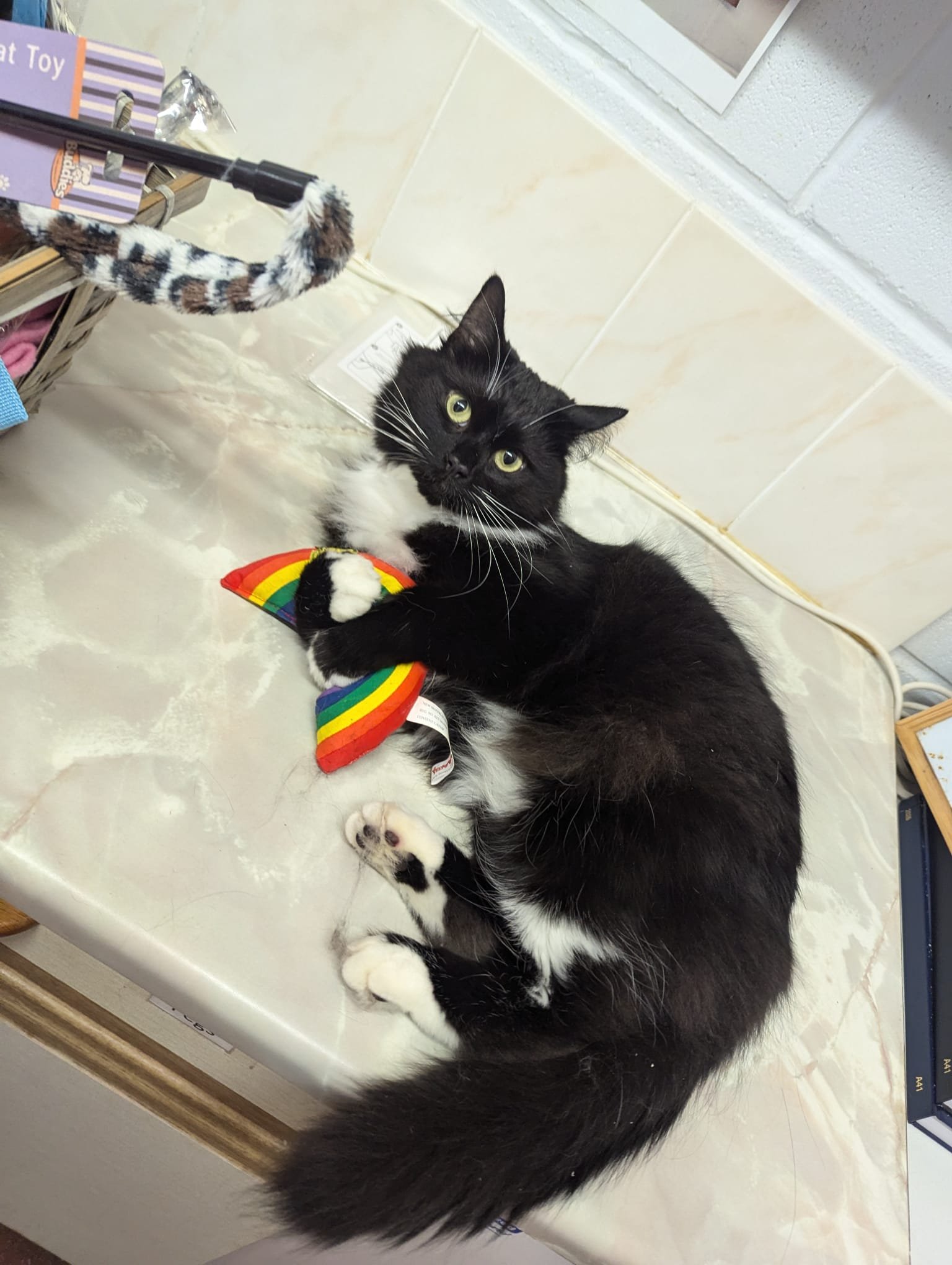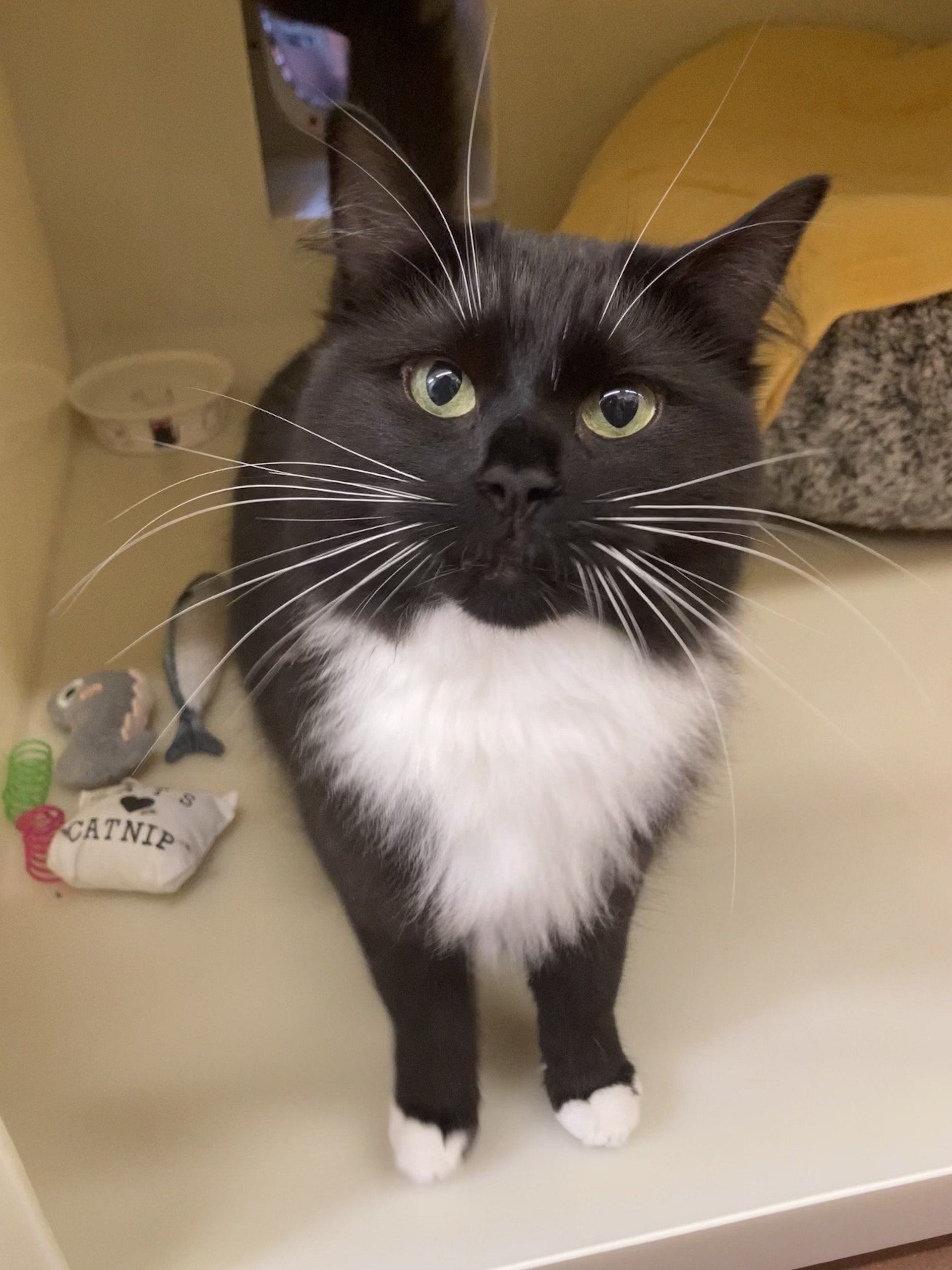 I am looking for a home where I will be allowed to just be myself. I’d love humans who will be around for cuddles and tickles when I want them, but who also understand that sometimes I do prefer my own space and will respect that, maybe even give me my own cosy spaces where I can take myself off for a quiet snooze. As I am still young, I do love to play, whether this is with the humans and those feather wands that I love or by myself with some smelly catnip/ valerian toys. I especially like toys that I can give a good kick- just to get out some of my energy. So, I’d love to have some kicker toys, although I do sometimes use my rugs and small carpet tiles for this too, it’s just good fun to beat them up! My carer says I can take my small carpet tiles home with me if I want when I do find my forever home. I also like to use scratch posts and cat trees for climbing, so would love to have some of these all to myself too. I know it sounds like I have a list for you, but if you love me enough then you should be happy to give me everything I want.