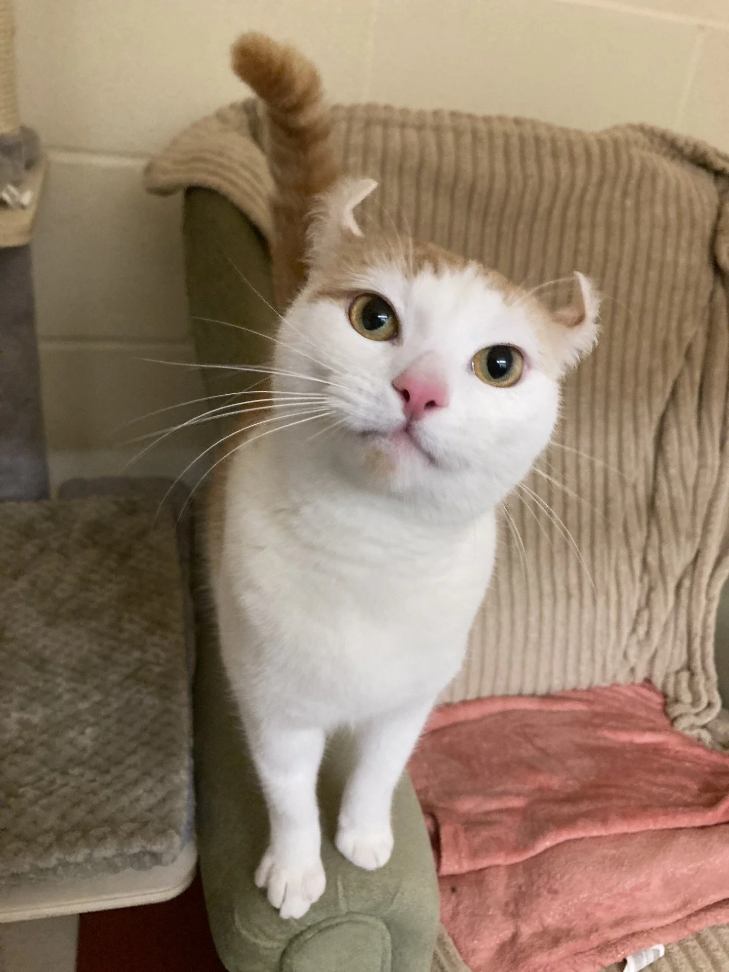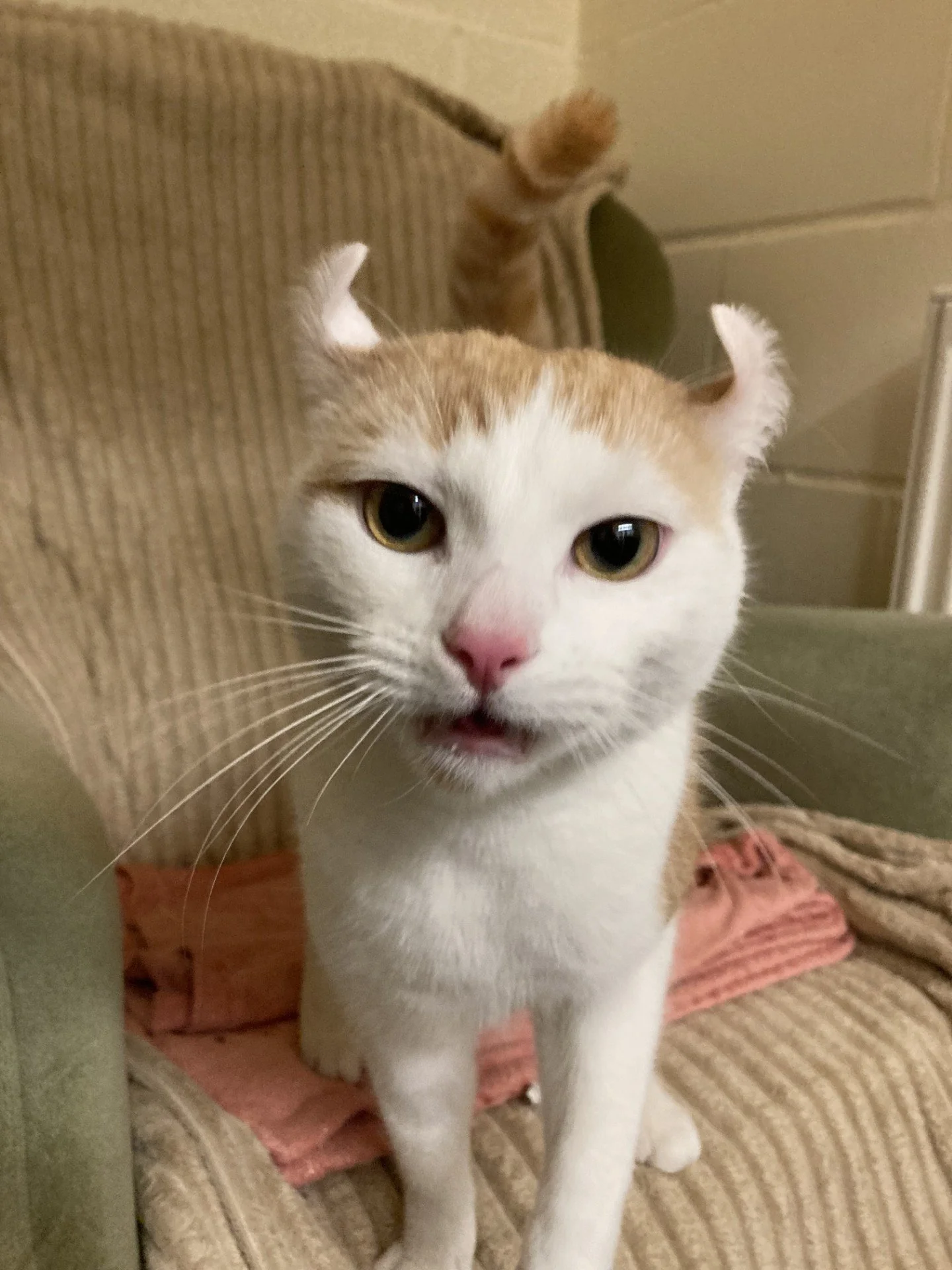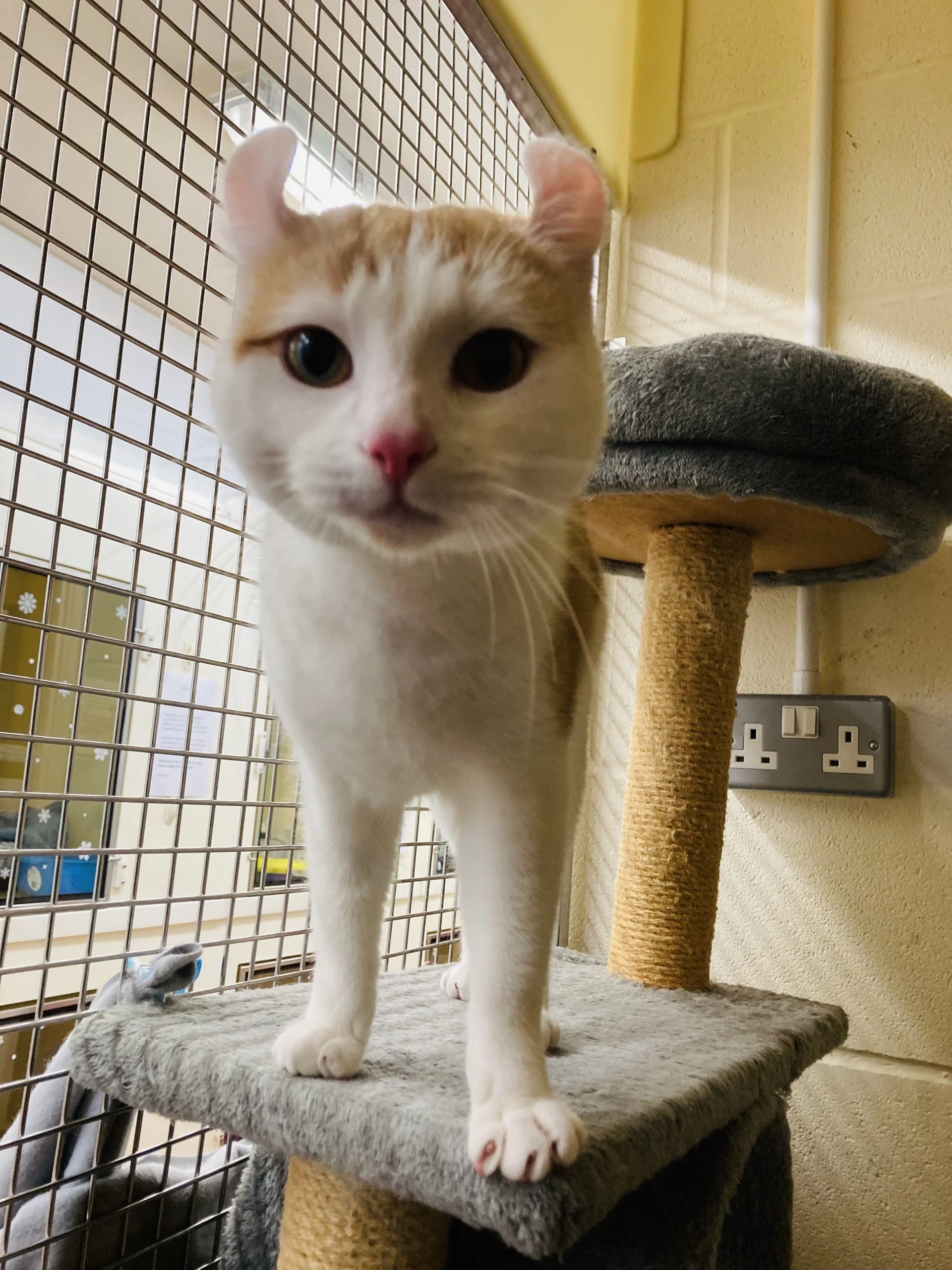 Our mommy cat was a Sphynx cross, she was hairless but had curly ears like me so my carers assume that she must have had some American Curl in her genes too. Our dad was a domestic shorthair (moggy), so this is my main breed, with a mixture of the other two in my DNA. Obviously I don’t look as though I have any Sphynx in me and look like a domestic shorthair with curled ears! I am very cute though, look at me!