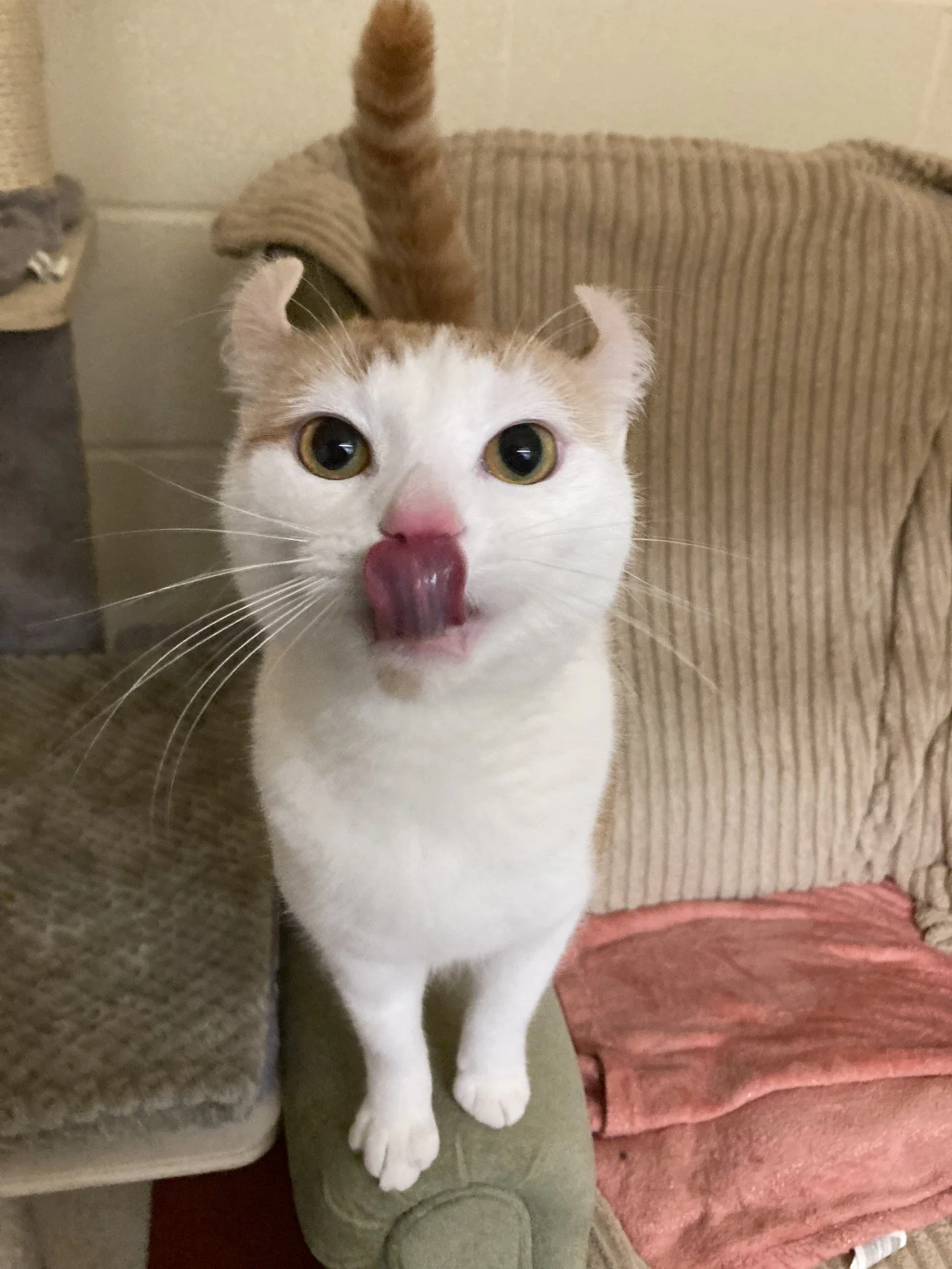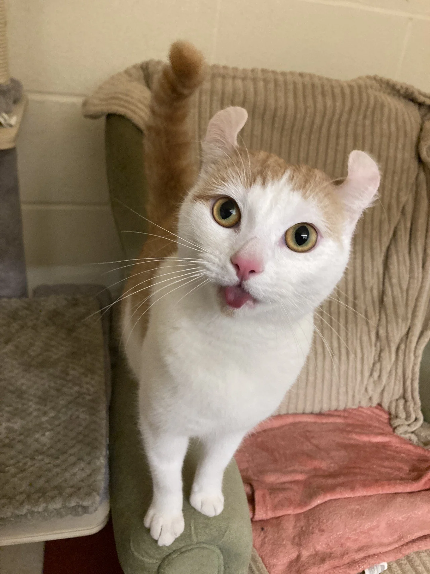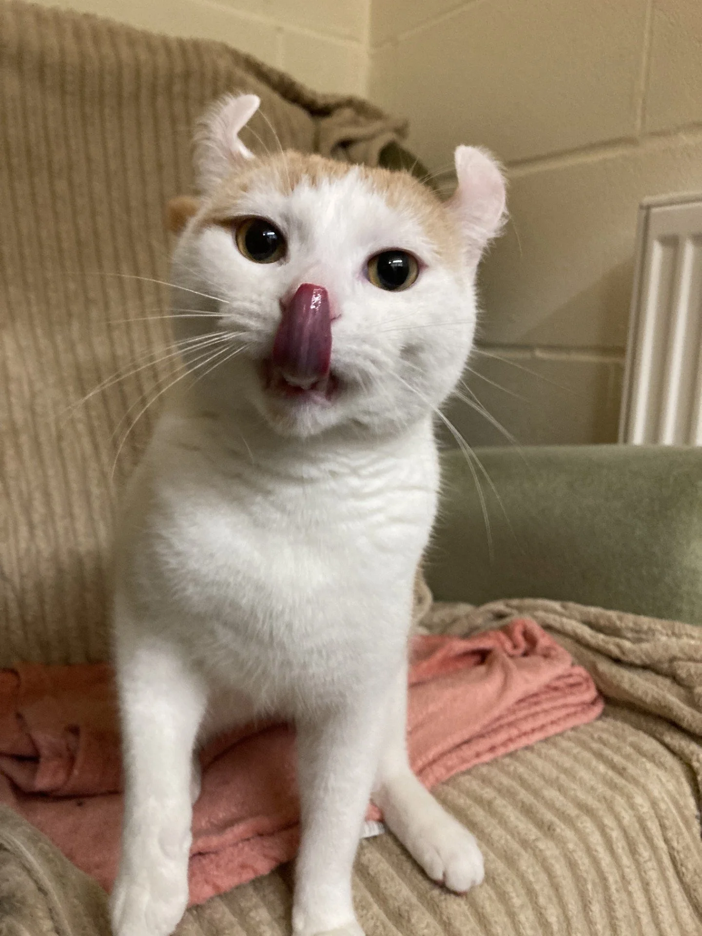 Our mommy cat was a Sphynx cross, she was hairless but had curly ears like me so my carers assume that she must have had some American Curl in her genes too. Our dad was a domestic shorthair (moggy), so this is my main breed, with a mixture of the other two in my DNA. Obviously I don’t look as though I have any Sphynx in me and look like a domestic shorthair with curled ears! I am very cute though, look at me!